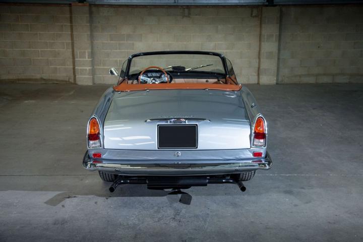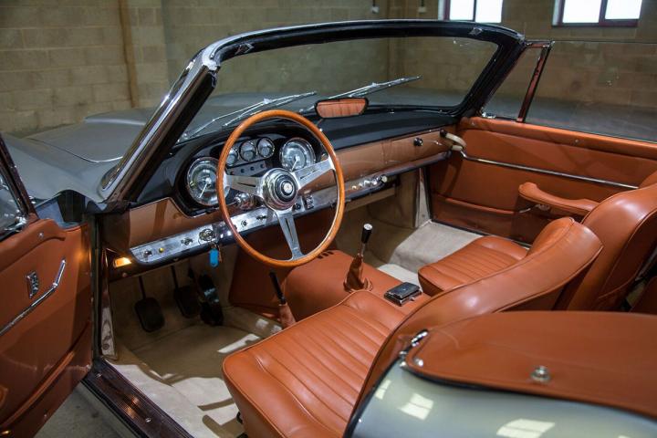 The 3500 GT was built on a tube platform chassis, constructed from tubes of square, round or elliptic section of Superleggera construction. Front suspension was by double wishbone coil springs, at the rear there was a Salisbury solid axle on semi-elliptic leaf springs, with hydraulic dampers an anti-roll bar and a longitudinal torque arm. Steering was of the recirculating ball type. The hydraulic brakes were initially Girling 12″ finned drum brakes front and rear; disc brakes were later introduced on the front wheels, and finally on all four. This Maserati 3500GT Vignale Spyder is equipped with front disc brakes and the optional Borrani knock-off wire wheels as well as a factory hardtop.