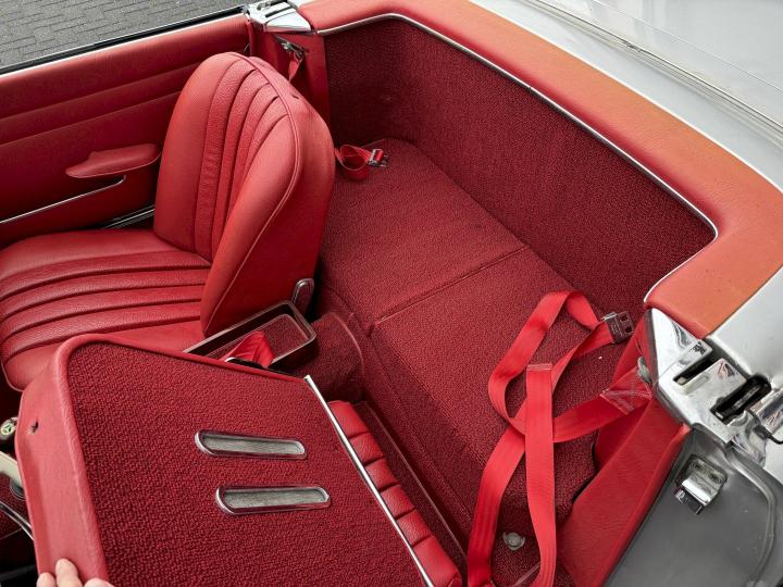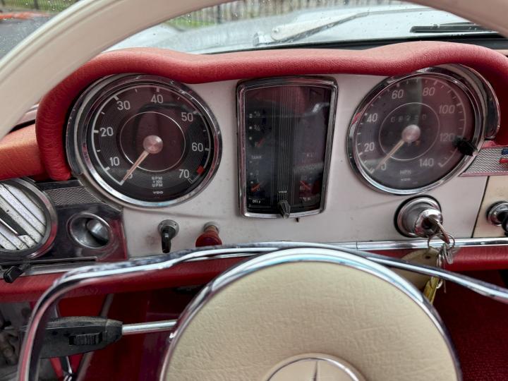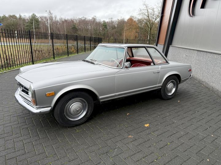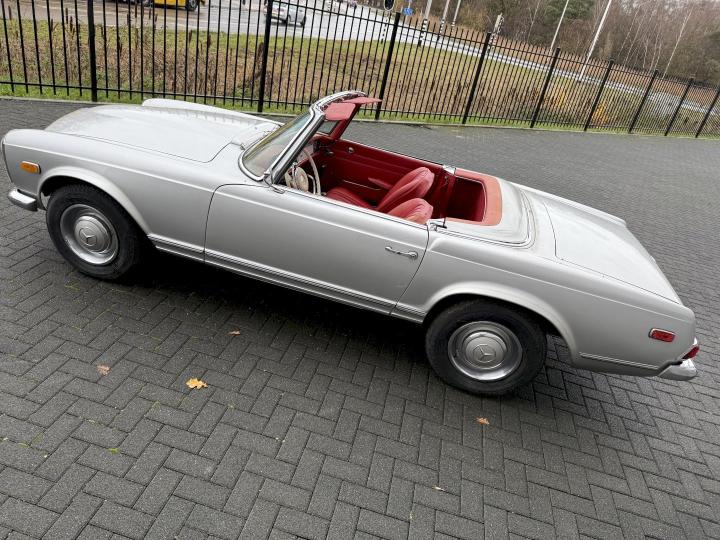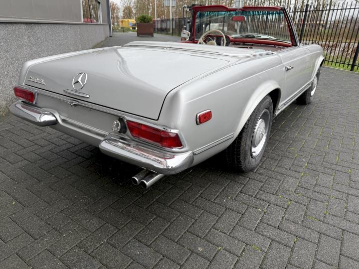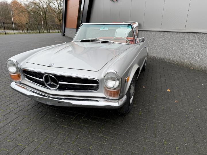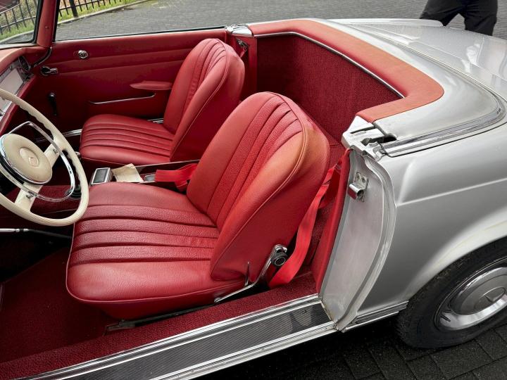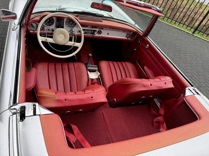 Matching nummer van origine Europese versie 230SL Pagode met 4 gang handschakeling, voorzien van hardtop en softtop, in het verleden naar Texas USA verkocht en voorzien van US versie koplampen en mijlenteller, leuke auto met een mooi rood leder interieur, dashboard hout is vernieuwd, qua body best redelijk goed en hoofdzakelijk origineel, het rechter voorscherm is in het verleden vernieuwd, motorisch en technisch in goede conditie.
