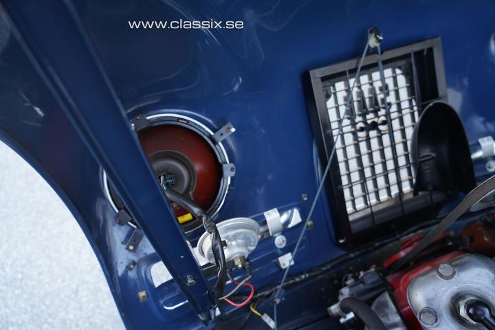 Exterior: The majority of the SAAB 96 Sport cars were or have later been painted red, most likely since SAAB became famous from their racing success and the cars they raced were red. What makes this SAAB 96 Sport stand out is that it is a beautiful dark blue original color. The car was restored around 2007, and the paint still looks very nice today. It is fitted with Ronal wheels and Toyo tires that suit the SAAB cars very well. The underneath of the car was painted with a black stone chip protection, and it is today 100% rust-free. All wearing parts like bushings and joints were replaced during the restoration, and the car has been driven 1,400 km since.
