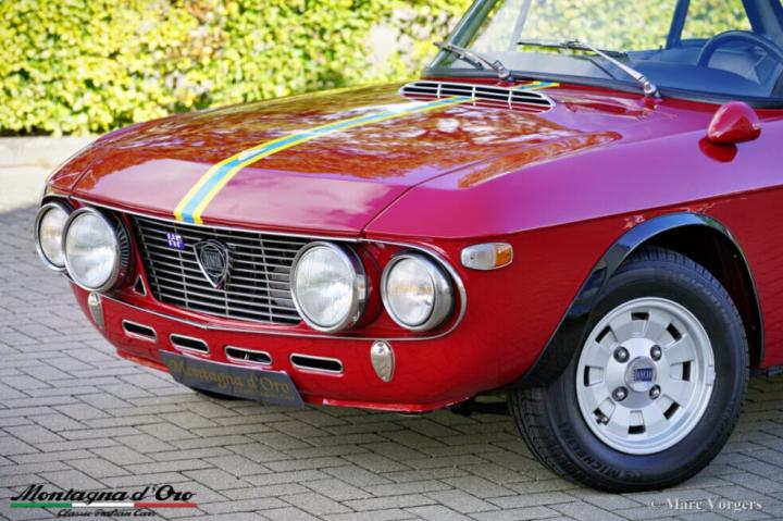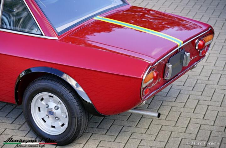Kleur donkerrood met gele en blauwe strepen waar er 100 van gemaakt zijn dit is dus de “laatste” van die 100 (geel/ blauw van de stad Turijn) gecombineerd met een zwartlederen interieur en zwart tapijt. Deze Lancia Fulvia Coupé 1600 HF is de heilige graal van het Fulvia programma.