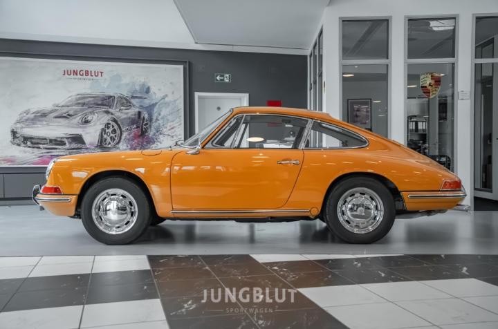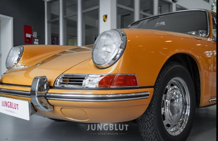 Porsche 911 Coupé („Ur-911“), gebaut am 10.10.1966 (mit grünen Ziffern), zugelassen am 26.05.1967, 2,0 l, 96 kW/130 PS, in der Originalfarbe Bahamagelb, mit 5-Gang-Getriebe, verchromten Lochscheibenrädern, Radio und Pepita-Sitzen.