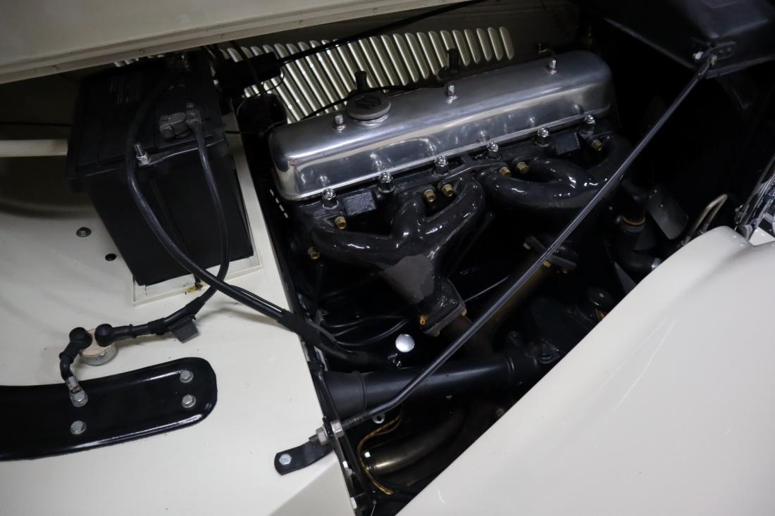 On December 21, 1937, this stately Jaguar SS 2.5 Liter Saloon left the factory to be shipped to Belgium. Here the car was registered on July 14, 1938. Many documents and the Heritage Centificate indicate that the original color was Suede Green. A somewhat dull color that fortunately was changed during the restoration to the also original Ivory. In combination with the beautiful green leather and tasteful wood finished interior, this is a real stunning combination.